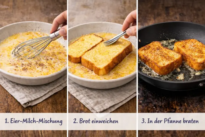 Brioche ist die erste Wahl. Es ist butterreicher, saugt die Eimischung besser auf und wird außen knuspriger als normales Toastbrot. Alternativ funktioniert auch Challah oder Milchbrot sehr gut. Wichtig: Das Brot sollte einen Tag alt sein — frisches Brot zerfällt beim Einweichen.